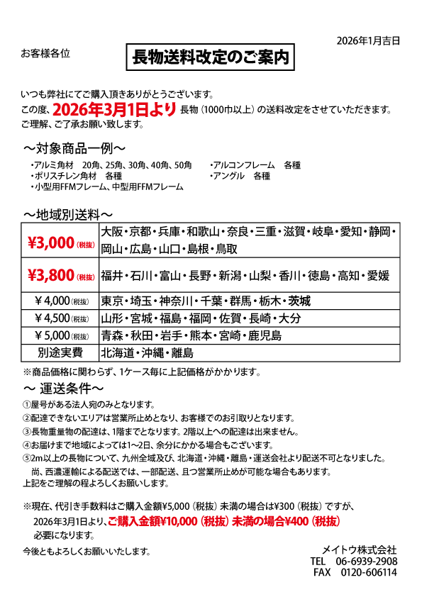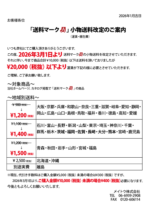 この度 2026年3月1日より以下の通り「送料」及び「代引き手数料改定」をさせていただきます。